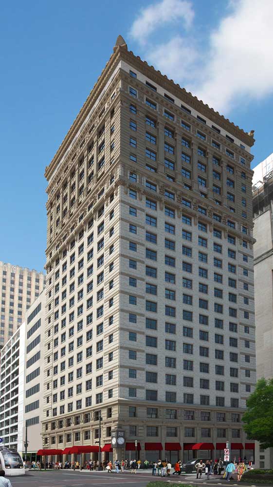 Located at 806 main in downtown Houston, we performed a feasibility study and commissioned this rendering of the building depicting the appearance after removal of the marble and glass slipcover.